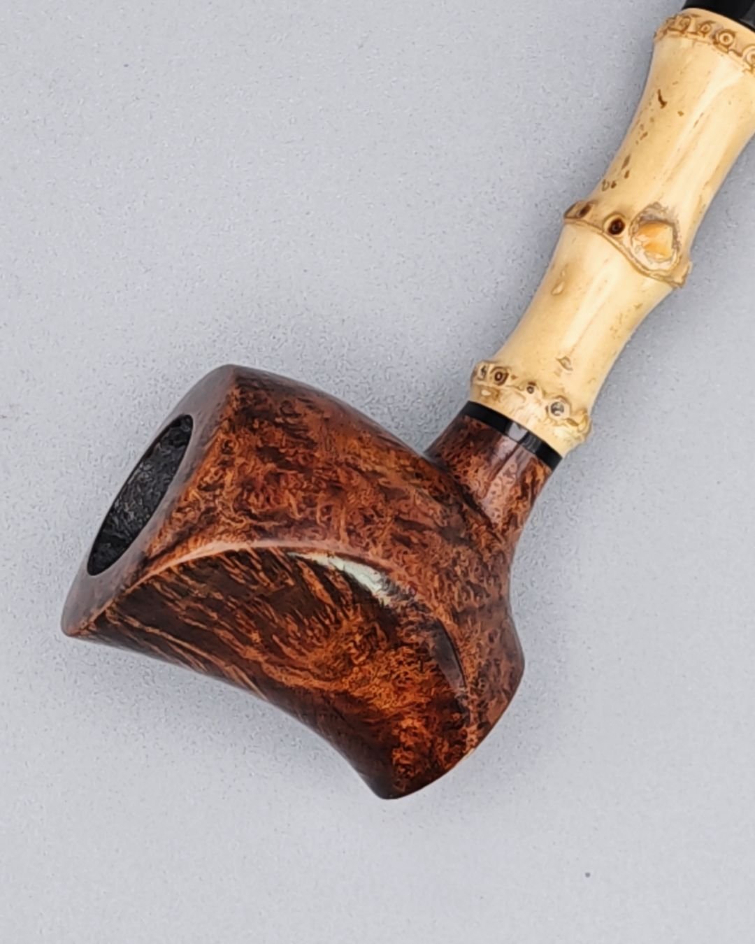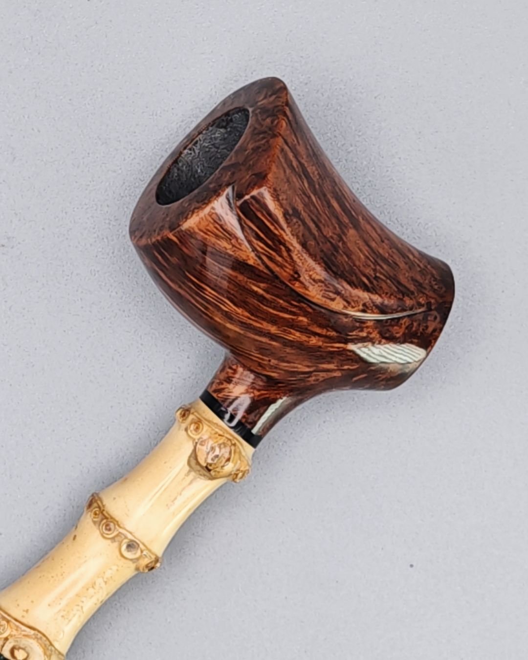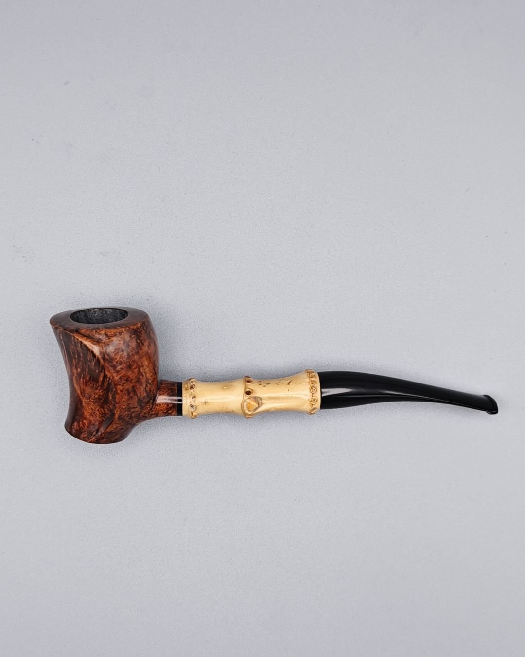 A freestyle design inspired by a three-ring bamboo bentpoker, the bowl features a rounded, ergonomic shape for comfortable handling. The polished briar and visible two-tone flame pattern in light brown and orange create a perfect contrast between the black of the mouthpiece and the warmth of the bamboo.